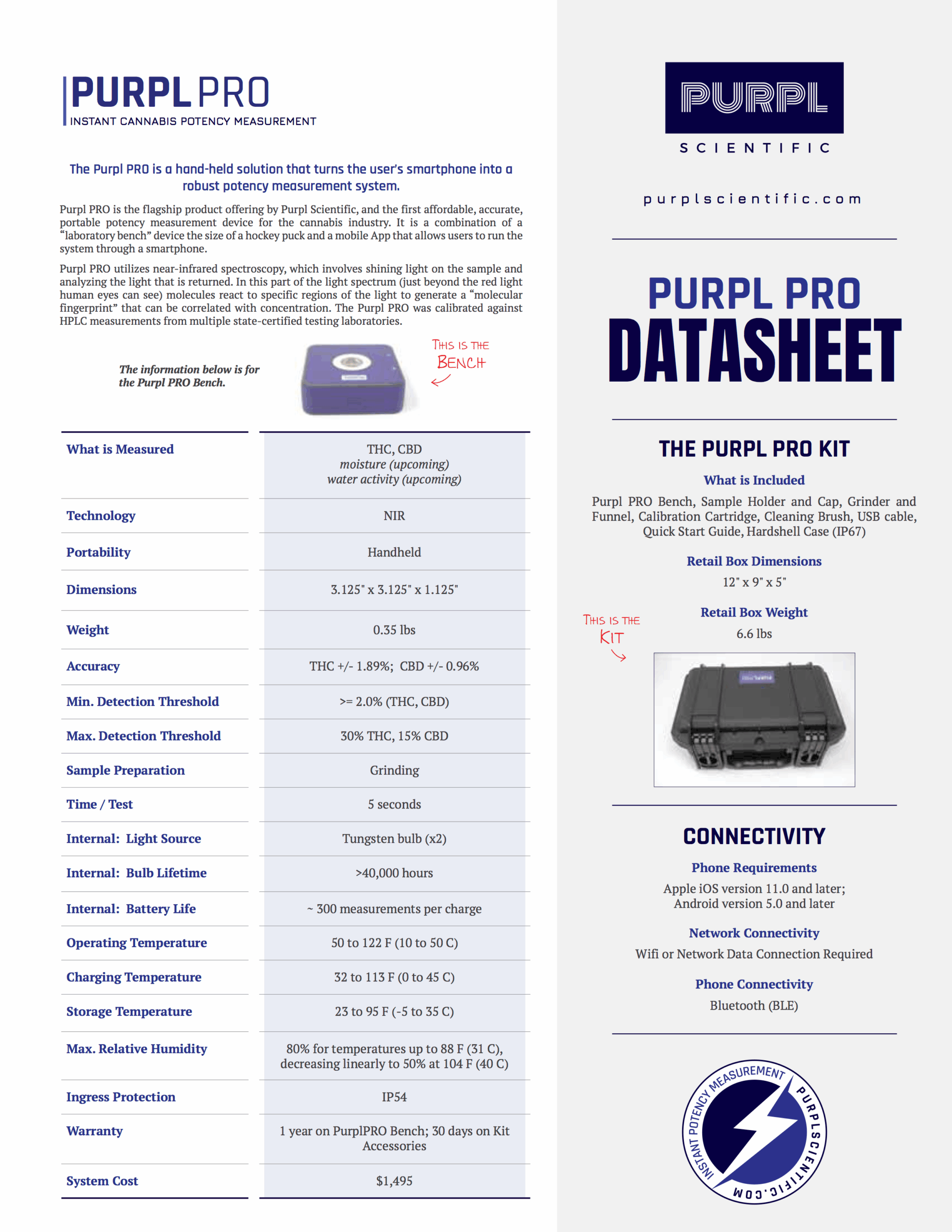 Purpl PRO utilizes near-infrared spectroscopy, which involves shining light on the sample and analyzing the light that is returned. In this part of the light spectrum (just beyond the red light human eyes can see) molecules react to specific regions of the light to generate a “molecular fingerprint” that can be correlated with concentration. The Purpl PRO was calibrated against HPLC measurements from multiple state-certified testing laboratories